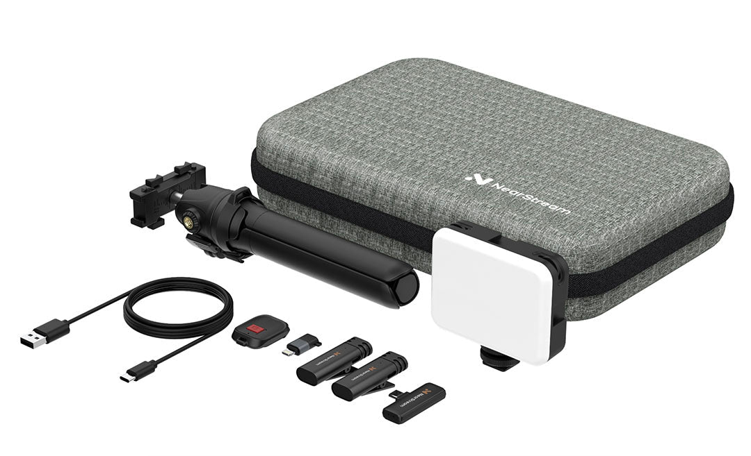 Premium video content on-the-go kit with a wireless microphone, tripod, and LED light. Perfect for vloggers, YouTube content creators, and various other video applications.